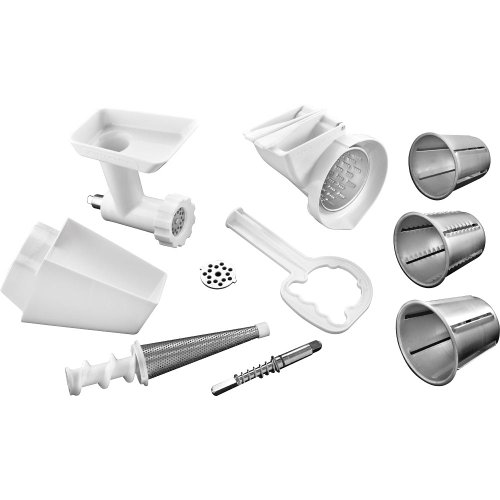 - Includes food grinder, slicer/shredder, and fruit/vegetable strainer